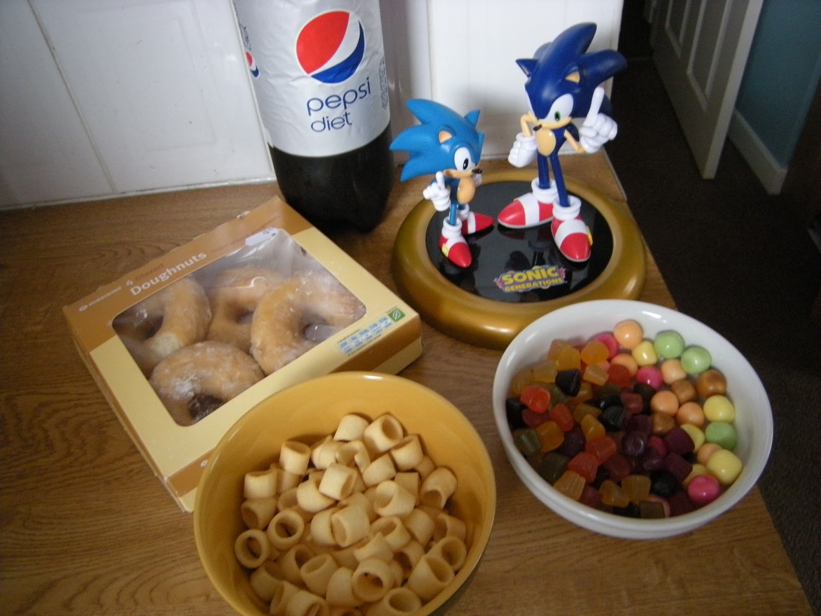 Our snacks for the night, watched over by my Generations statue. We've got Gold Rings (hula hoops), Midget Chaos Gemeralds, Maom Sonic Spinballs and larger rings through which we would later jump and attempt to get the blue spheres.